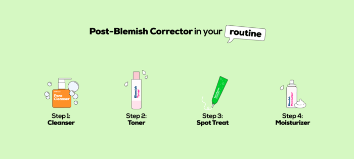 Now that we’ve established how to layer products in your routine, our Post-Blemish Corrector as a spot treatment product would follow your toner. But if you don’t have a toner in your routine you can apply it after your cleanser.