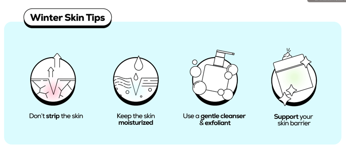 If your skin experiences dryness during winter you can cut back on cleansing twice a day to once a day (to remove makeup and spf at the end of the day). A gentle milky cleanser may also help to prevent stripping the skin of its natural oils.